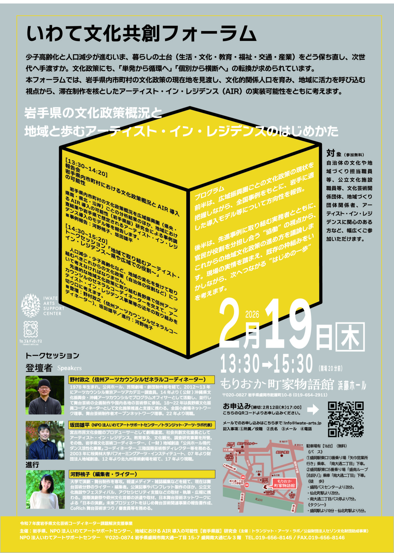 主催:岩手県、NPO法人いわてアートサポートセンター、地域におけるAIR導入の可能性[岩手県版]研究会(主催:トランジット・アーツ・ラボ/公益財団法人セゾン文化財団助成事業,